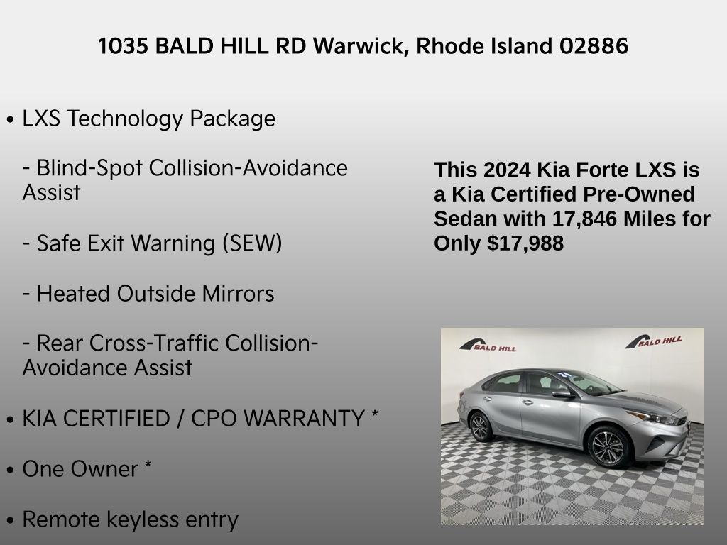 Recent Arrival! KIA CERTIFIED / CPO WARRANTY *, One Owner *, Forte LXS, 2.0L I4 MPI, CVT, FWD, Steel Gray, Black Cloth, Apple CarPlay & Android Auto, Auto High-beam Headlights, Blind-Spot Collision-Avoidance Assist, Delay-off headlights, Exterior Parking Camera Rear, Fully automatic headlights, Heated Outside Mirrors, LXS Technology Package, Panic alarm, Power door mirrors, Rear Cross-Traffic Collision-Avoidance Assist, Remote keyless entry, Safe Exit Warning (SEW), Security system, Steering wheel mounted audio controls, Telescoping steering wheel, Tilt steering wheel.